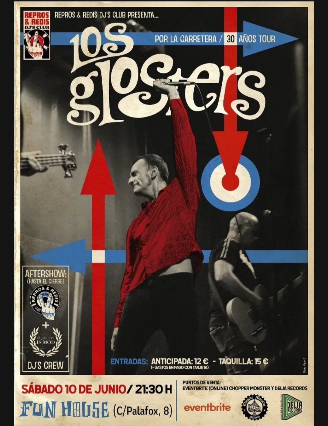 Y después del concierto, sigue la FIESTA con los ritmos más salvajes y bailongos con REPROS & REDIS DJ’S CLUB y la colaboración de ALL YOU NEED IS MOD DJ’S CREW con: Pedro Pablo de León, Queco Ribes de Murcia y Jimmy Alcalá de Madrid.Ladies and Gentlemen se lo van a dejar perder? No, no, no LOS GLOSTERS + FIESTA ¡que corra la voz!