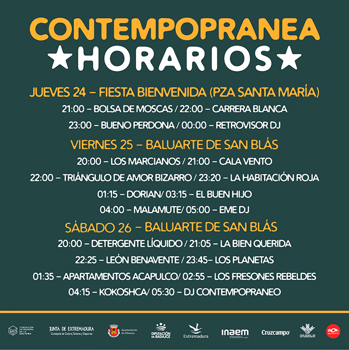 04:15 – Kokoshca / 05:30 – Dj ContempopraneoCONTEMPOPRANEA 2023 OS ESPERA EN OLIVENZA CON LA ESENCIA DEL INDIE NACIONAL EL 24, 25 Y 26 AGOSTO.