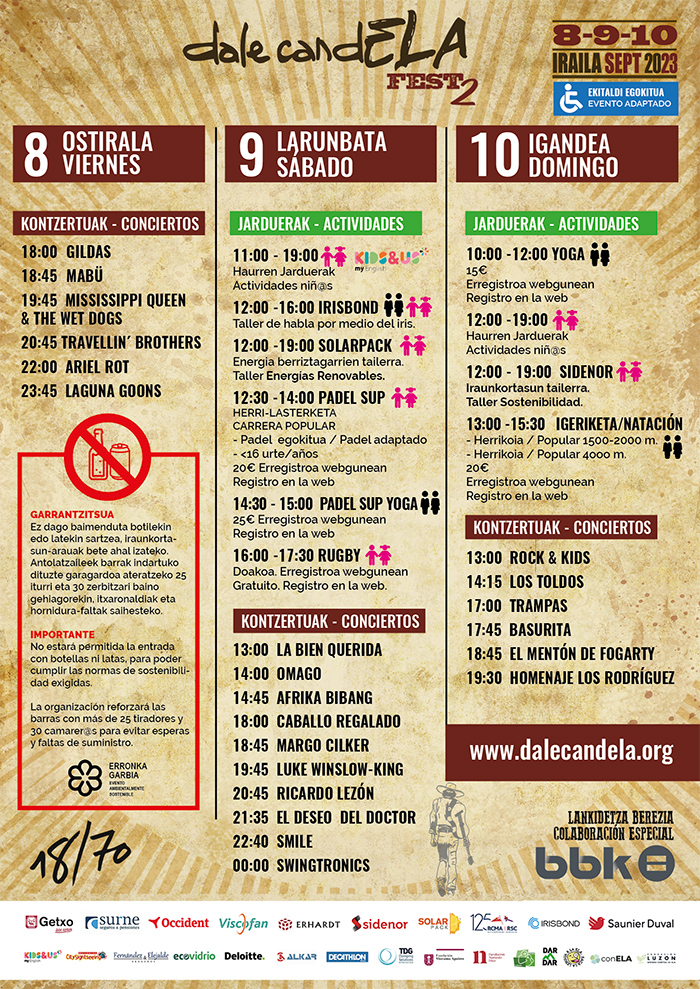 Será, además, un festival que va más allá de la música, un evento pensado para todos los públicos, de entrada gratuita. La organización ha anunciado un programa muy intenso con diversas actividades artísticas y deportivas que se irán desarrollando a lo largo del fin de semana, reflejando todas ellas el espíritu de DalecandELA.