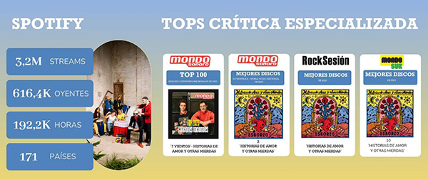 Además, `Historias de Amor y Otras Mierdas’ entró en el Top 3 Mejores Discos de Mestizaje-World Music Nacional de 2023 de Mondosonoro y en el Top 10 de Mejores Discos de 2023 para Mondosonoro Edición Sur.