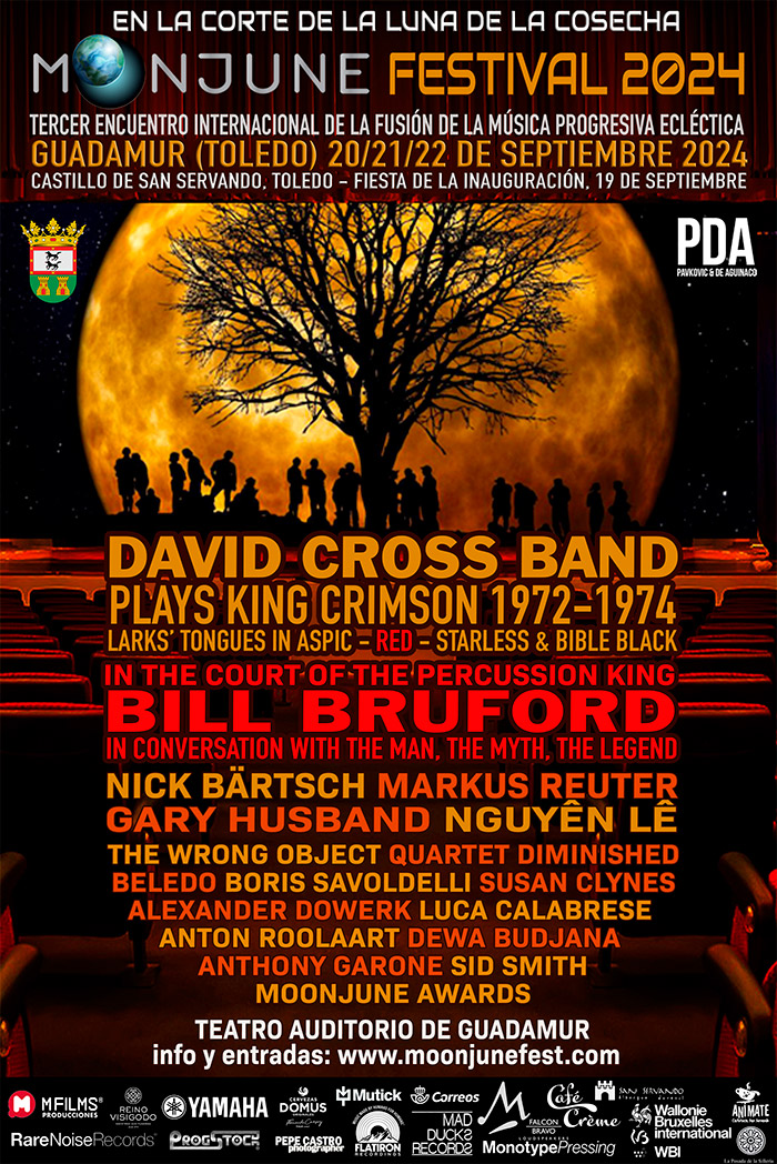Bill Bruford, uno de los baterías más importantes de la historia del rock progresivo y del jazz-fusión, participará en una mesa redonda sobre King Crimson 1972-1974 (álbumes históricos: Lark’s Tongues In Aspic, Starless & The Bibble Black y Red) y se reunirá con fans para firmar discos y libros; y responder a sus preguntas. De antemano, manifestará su intención de volver a tocar y recibirá un reconocimiento de la organización del Moonjune Festival Toledo 2024 junto al Ayuntamiento de Guadamur y Tama Drums; distinción con motivo de su amplia trayectoria artística y sus 75 años de vida; un evento dedicado íntegramente a la figura del artista y conducido por el célebre periodista Sid Smith.