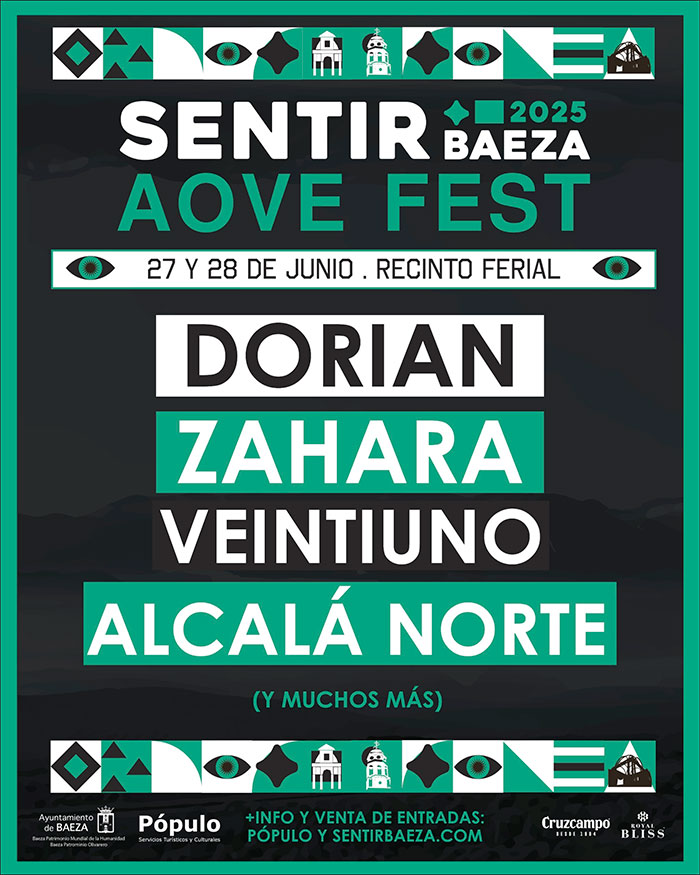 Sentir Baeza AOVE Fest 2025 continúa programando un cartel excepcional con los grupos y artistas más punteros de la escena nacional. El festival se desarrollará en dos escenarios, cuyo único requisito será vivir una experiencia única. El recinto contará con una zona gastronómica con foodtrucks, barra de bebidas, zona de merchandising de los artistas, un área de descanso y zona de aseos. Para facilitar los desplazamientos, se habilitarán autobuses lanzadera desde Jaén, Úbeda y Linares. Sentir Baeza AOVE Fest 2025, organizado por Populo Servicios Turísticos y el Ayuntamiento de Baeza, mantiene su compromiso con la Cultura y pone en valor a la Ciudad de Baeza, Patrimonio de la Humanidad desde el año 2003 por el conjunto de monumentos renacentistas; un evento que destaca el centro de producción de Aceite de Oliva Virgen Extra (AOVE) de su localidad, como seña de identidad y como principal reclamo gastronómico de la provincia