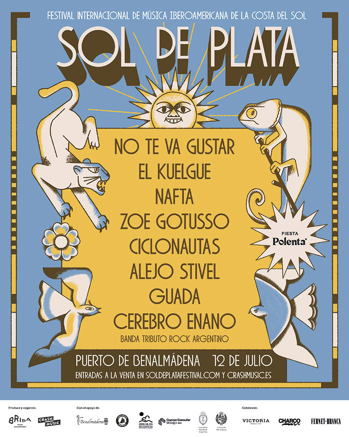 Kit de Prensa Aquí El próximo 12 de julio, el Puerto de Benalmádena será escenario del I Festival de Música Iberoamericana ‘Sol de Plata’, un evento que tenderá un puente cultural y sonoro entre el Río de la Plata y la Costa del Sol y por donde pasarán artistas de la talla de Alejo Stivel, No Te Va Gustar, El Kuelgue, Nafta, Zoe Gotusso, Ciclonautas, Guada y Cerebro Enano.