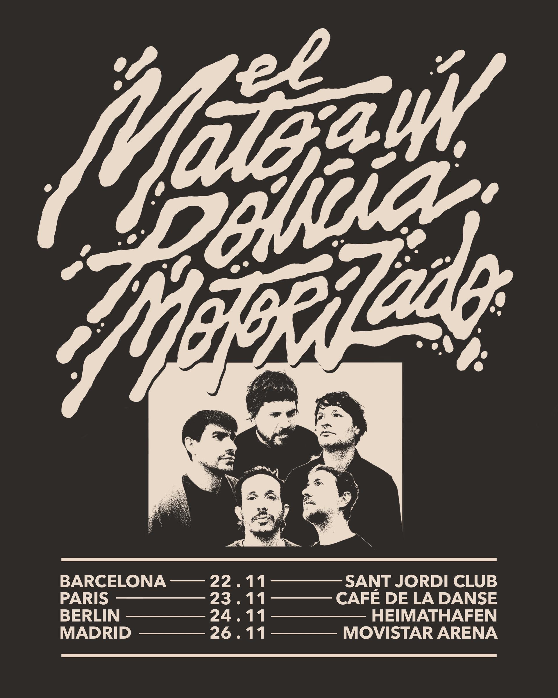 Todo esto antecede a una gira que les traerá de nuevo a Europa para cerrar capítulo, y en la que disfrutaremos de las dos fechas más multitudinarias de El Mató a un Policía Motorizado hasta la fecha en nuestro país: el Sant Jordi Club de Barcelona y el Movistar Arena de Madrid vibrarán con hits como “El Tesoro” o “Diamante Roto” los días 22 y 26 de noviembre respectivamente. También pasarán en esta corta gira europea por la sala Heimathafen Neukölln de Berlín el 23 de noviembre y el parisino Café de la Danse el 24.