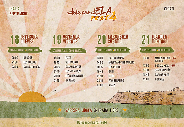 El Puerto Viejo de Getxo se prepara para recibir la cuarta edición del DalecandELA Fest, que tendrá lugar del 18 al 21 de septiembre. La asociación DalecandELA anuncia los horarios oficiales del festival, un evento con entrada gratuita que se ha convertido en una pieza clave para dar voz y recaudar fondos para la lucha contra la Esclerosis Lateral Amiotrófica (ELA). Con la confirmación de los horarios, el festival entra en su recta final y promete un fin de semana de música, solidaridad y esperanza. El cartel, ya conocido, incluye a grandes nombres como Iván Ferreiro, Los Zigarros, Coti, León Benavente y Carlos Ares, entre muchos otros, quienes se subirán al escenario para apoyar una causa vital.